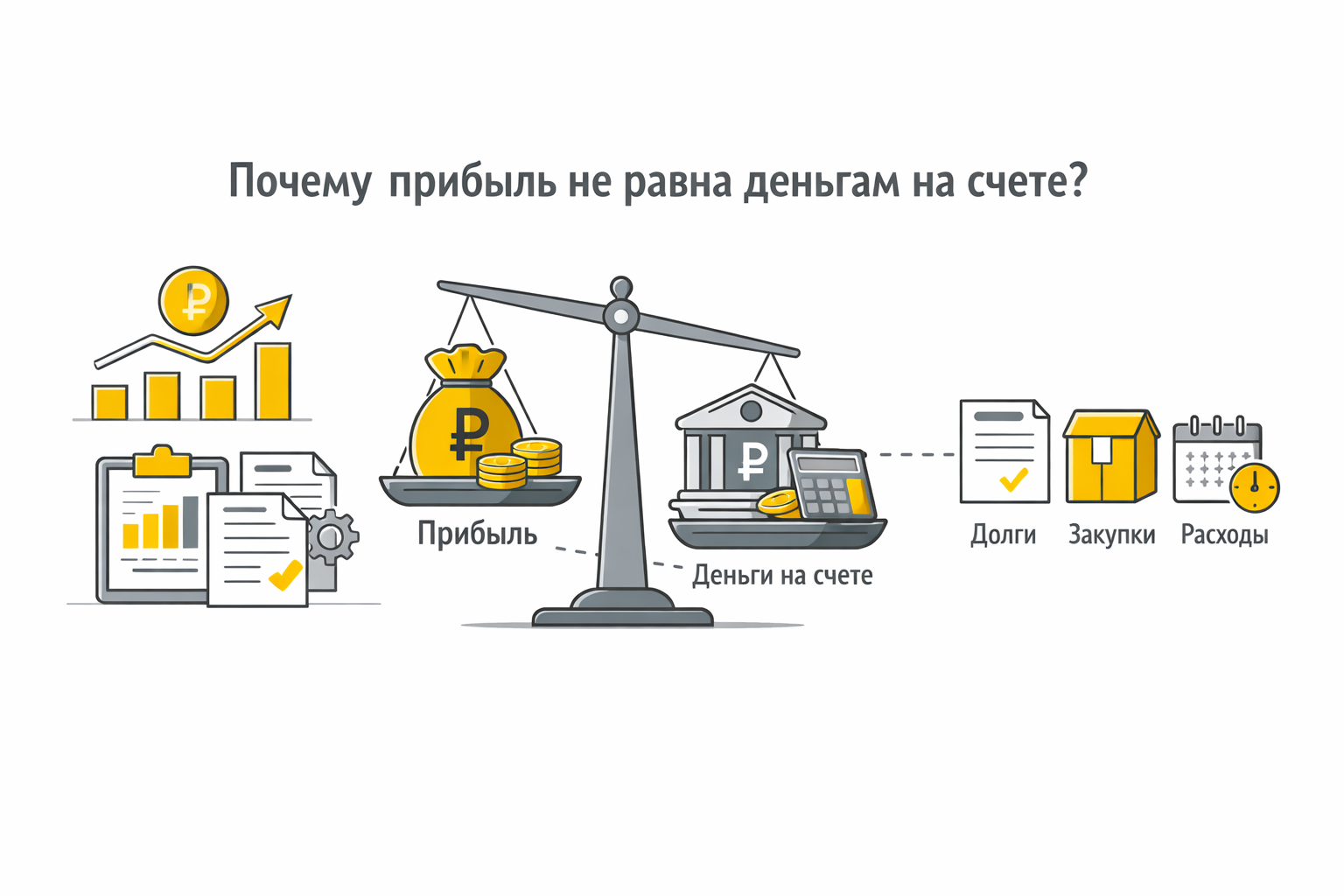 Можно быть прибыльным на бумаге и постоянно сидеть без денег. Прибыль — расчётная величина, деньги — реальные. Отсрочки, авансы, налоги и закупки легко создают кассовые разрывы.